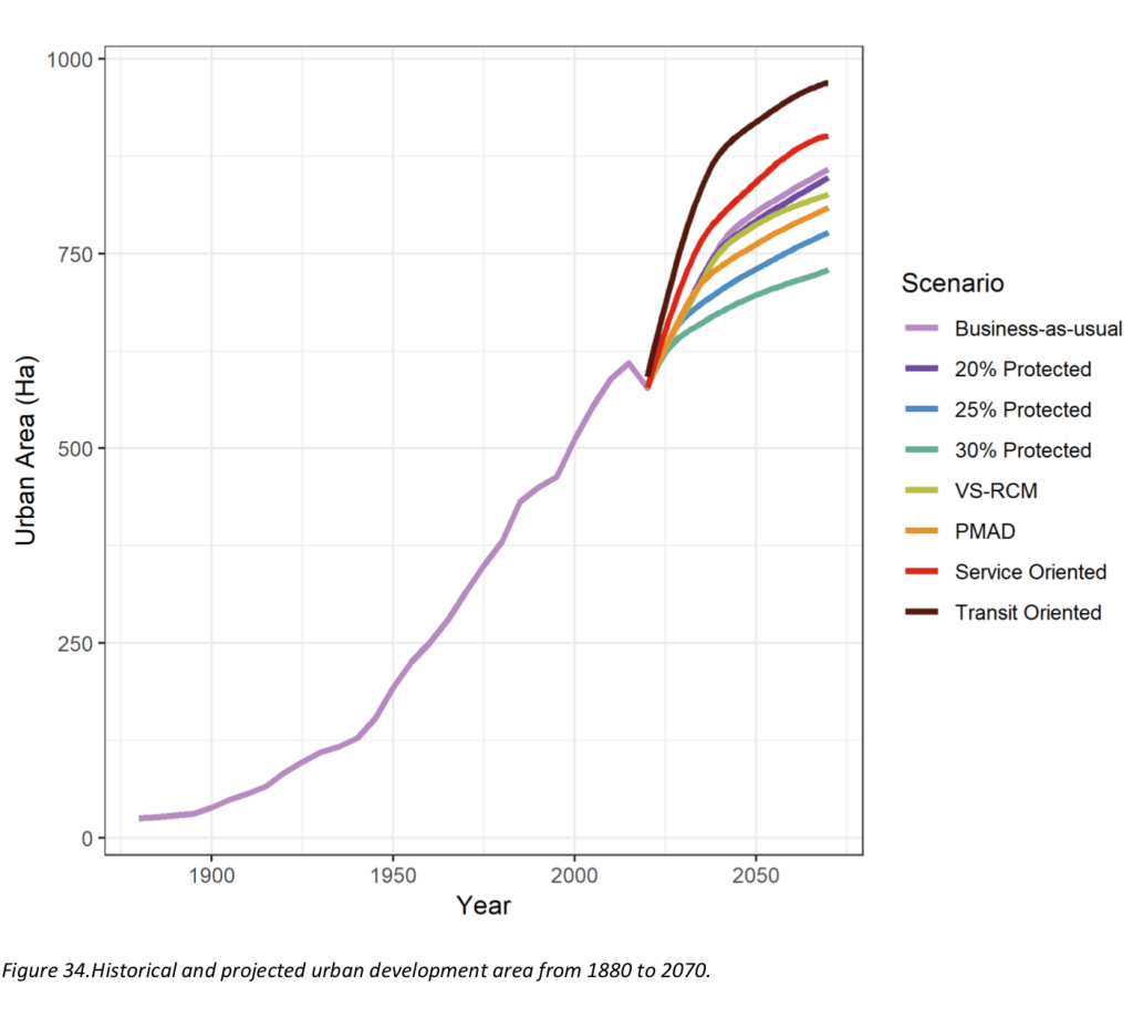 Aptly Quebec blue on both maps, these natural areas are defined as high priorities in the master plans of the Montreal Metropolitan Community and MRC. What I find odd is that while Hudson’s business-as-usual data shows a decrease in the total number of hectares developed, Eco2Urb projects significant increases in every scenario. On what basis?
