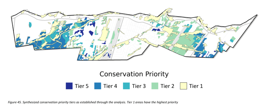(For more on how the colour-coded tiers came about, read my previous thousandlashes.ca posts Development vs. conservation: hope for a path forward, Nov. 14, 2019 and Eco2Urb report: plan to protect, July 9, 2020.)